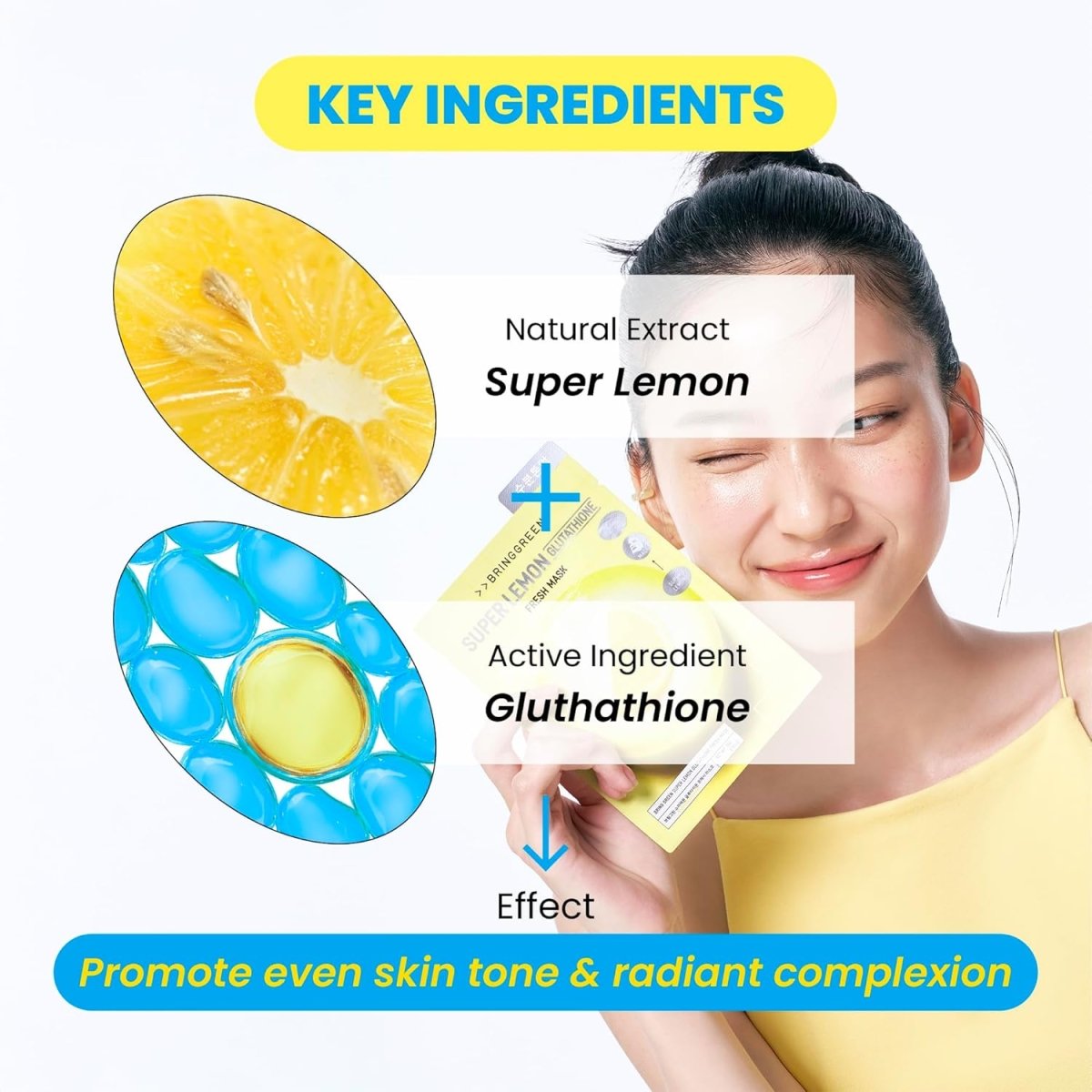 This refreshing sheet mask is packed with Super Lemon Juice and Glutathione to brighten, tone, and refresh your skin. The Super Lemon Juice offers four times more vitamin C than regular lemon, revitalizing dull skin. Glutathione works to enhance radiance and even skin tone with its powerful antioxidant properties. Additionally, 10 kinds of vitamins nourish, protect, and energize the skin, leaving you with a healthy, glowing complexion.